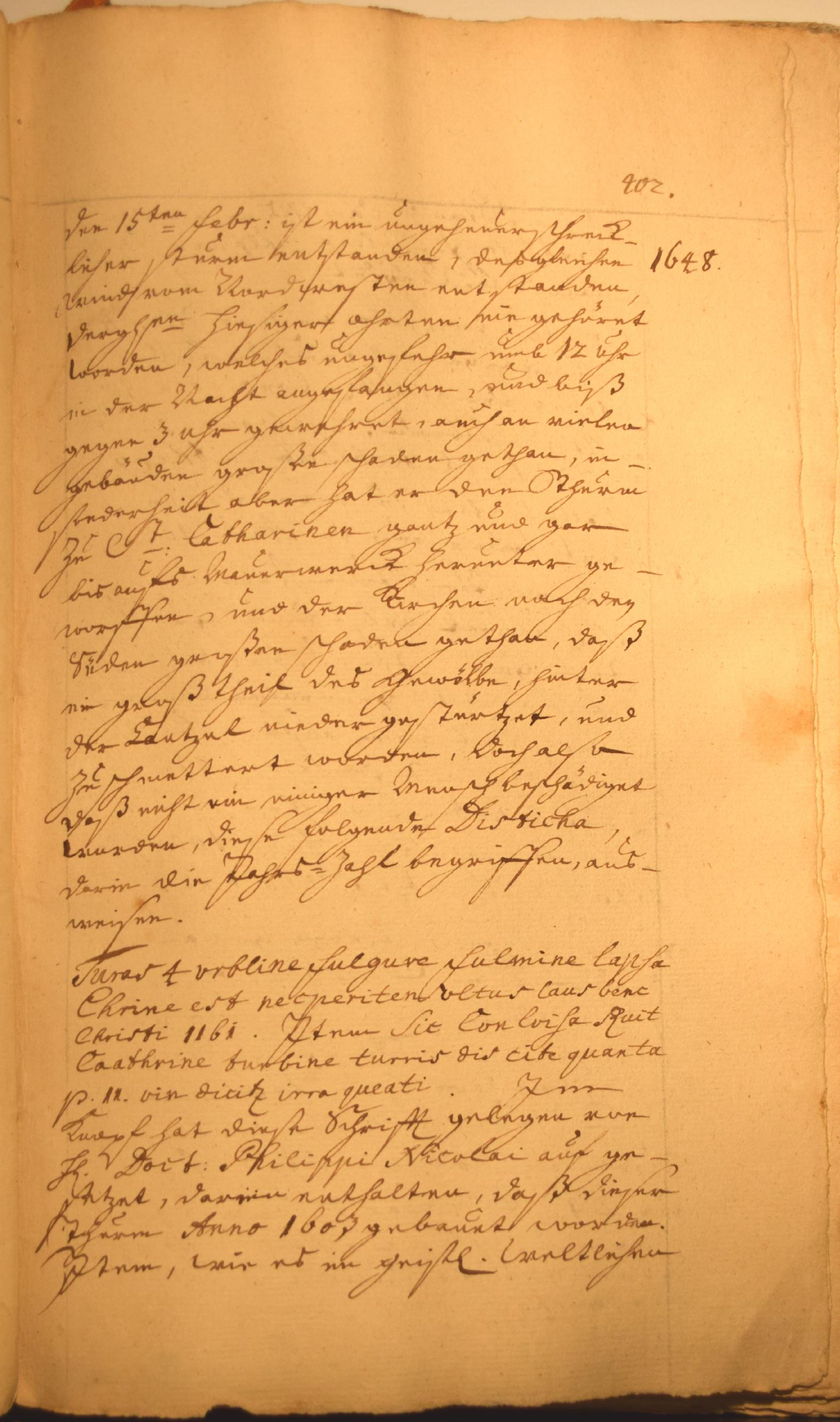 [278] Den 15ten Febr(uar) ist ein ungeheuer schrecklicher sturm entstanden, desgleichen wind vom Nordwesten entstanden, dergl(eichen) hiesiger ohrten nie gehöret worden, welches ungefehr umb 12 Uhr in der Nacht angefangen, und biß gegen 3 Uhr gewehret, auch an vielen gebäuden großen schaden gethan, insonderheit aber hat er den Thurm zu St. Catharinen gantz und gar bis aufs Mauerwerck herunter geworffen, und der Kirchen nach den Süden großen schaden gethan, daß ein groß Theil des Gewölbe, hinter der Cantzel nieder gestürtzet, und zuschmettert worden, doch also daß nicht ein einiger Mensch beschädiget worden, diese folgende Disticha, darin die Jahrs-Zahl begriffen, ausweisen. Turas 4 ubline fulgare fulmine lapsa Chrine est necperiten ultus laus benc Christi 1161. Jtem Sic Concluisa Ruit Caathrine turbine turris dis cite quanta p. 11. uin dicitz irra queati. Jm Knopf hat diese Schrifft gelegen von H(errn) Doct(or) Philippi Nicolai auf gesetzet, darin enthalten, daß dieser Thurm Anno 1603 gebauet worden. Jtem wie es in geistl(ichen) weltlichen