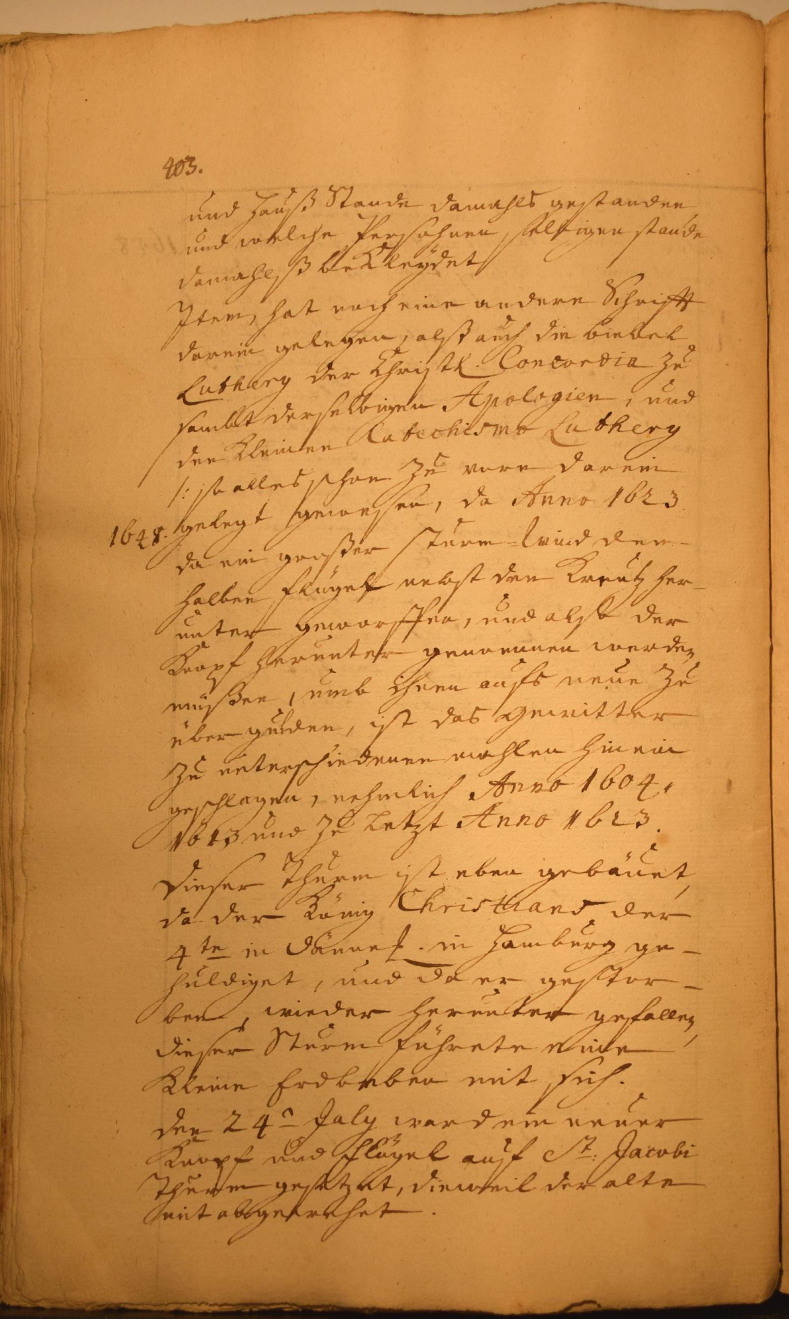 und Hauß Stande damahls gestanden, und welche Persohnen selbigen stande damahlß bekleydet. Jtem, hat noch eine andere Schrifft darein gelegen, alß auch die Biebel Luthery der Christl(ichen) Concordia zu sambt derselbigen Apologien, und den kleinen Catechismo Luthery /:so alles schon zu vorn darin gelegt gewesen, da Anno 1623. da ein großer sturm-wind den halben flügel nebst den Kreutz herunter geworffen, und also der Knopf herunter genommen werden müßen, umb ihnen aufs neue zu übergulden, ist das Gewitter zu unterschiedenen mahlen hinein geschlagen, nehmlich Anno 1604, 1613 und zu Letzt Anno 1623. Dieser Thurm ist eben gebäuet, da der König Christians der 4te in Dänne(mark) in Hamburg gehuldiget, und da er gestorben, wieder herunter gefallen, dieser Sturm führete eine kleine Erdbeben mit sich.